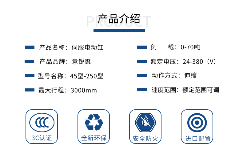 通过多年坚持不懈的努力、公司研发生产的伺服电动缸具有结构紧凑、高精度、高响应、低摩擦、运行平稳、寿命高等 特点、深受广大客户的好评。产品可广泛应用于机械自动化行业、汽车行业、电子行业、冶金行业等。